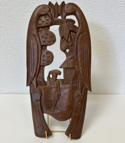 Handgeschnitztes Holzrelief mit Vogelpaar und Dorfszene – Set aus zwei Wandobjekten