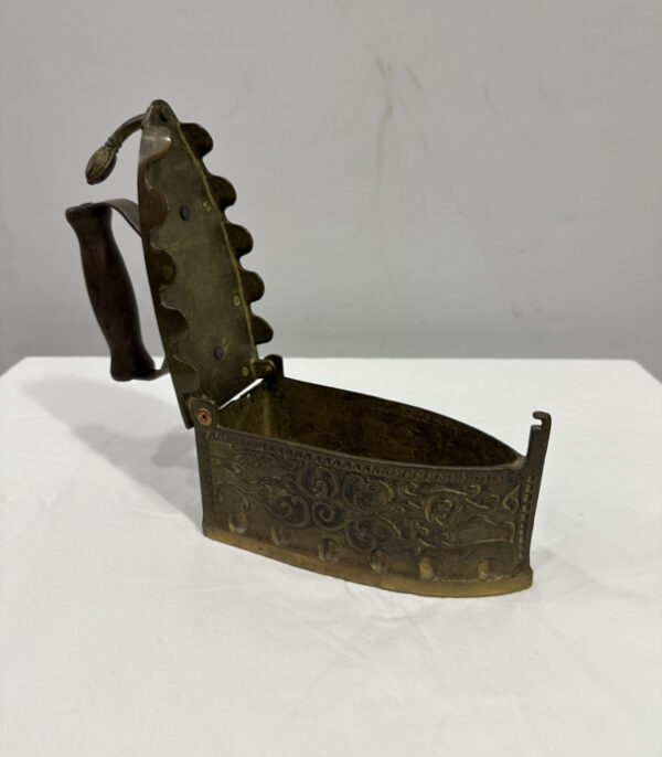 Antikes Kohlebügeleisen aus Messing mit Holzgriff und Ornamentdekor