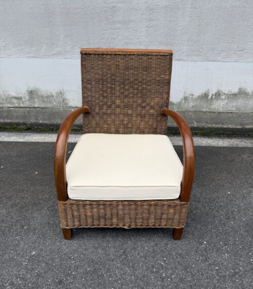 Rattan Sessel mit Holzarmlehnen und cremefarbenem Kissen