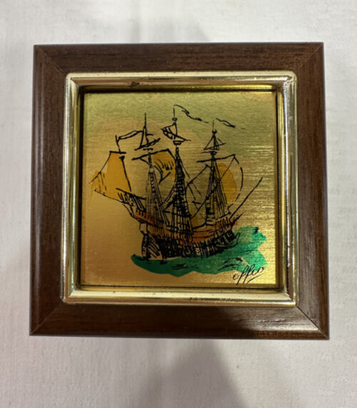 Kleine Schmuckschatulle mit Segelschiff-Motiv auf Goldgrund