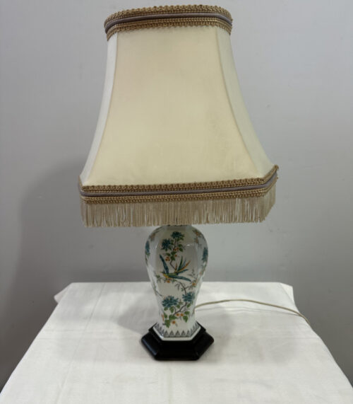 Vintage Tischlampe Drimmer 1980er Jahre mit Porzellan Fuss und Fransen Schirm