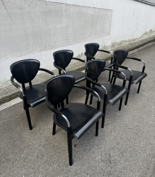 6er-Set Vintage Leder Armlehnstühle aus Holz mit Chromdetails