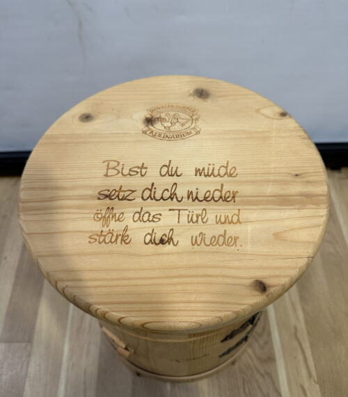 Rustikaler Holz Hocker mit Stauraum für Wein und Gläser