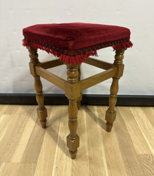 Vintage Holzhocker mit rotem Veloursbezug
