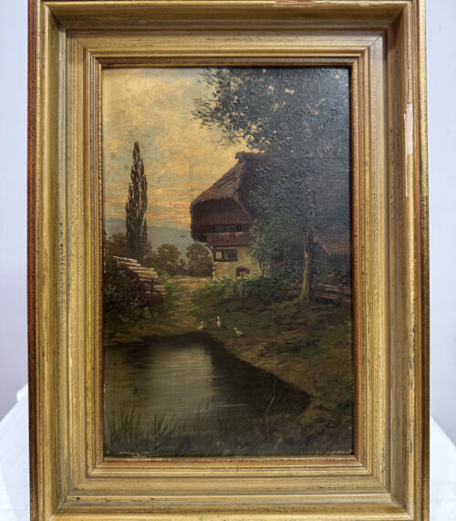 Ölgemälde Bauernhaus am Weiher im Sonnenuntergang