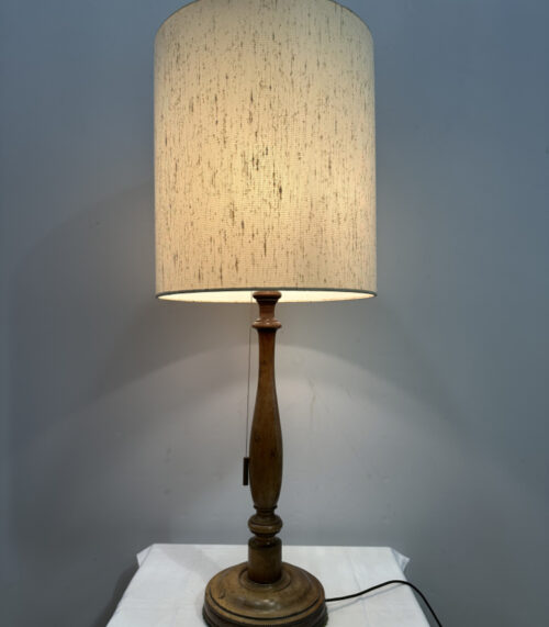 Vintage Tischlampe mit Holzfuss und zylindrischem Stoffschirm