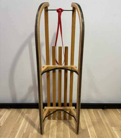 Klassischer Holzschlitten mit Metallkufen und Zugband