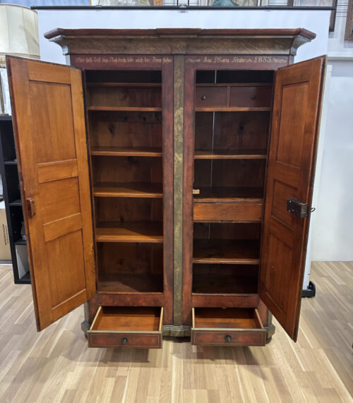 Antiker Bauernschrank von 1833 mit Bauernmalerei und Spruchband