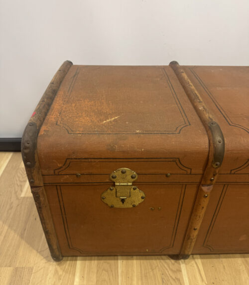 Antiker Überseekoffer – Holz, Messingbeschläge, Innenfutter gestreift