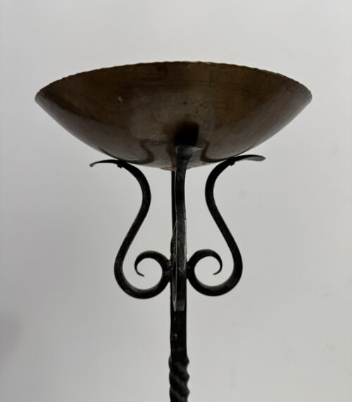 Rustikaler Kerzenhalter aus Schmiedeeisen mit Kupferschale