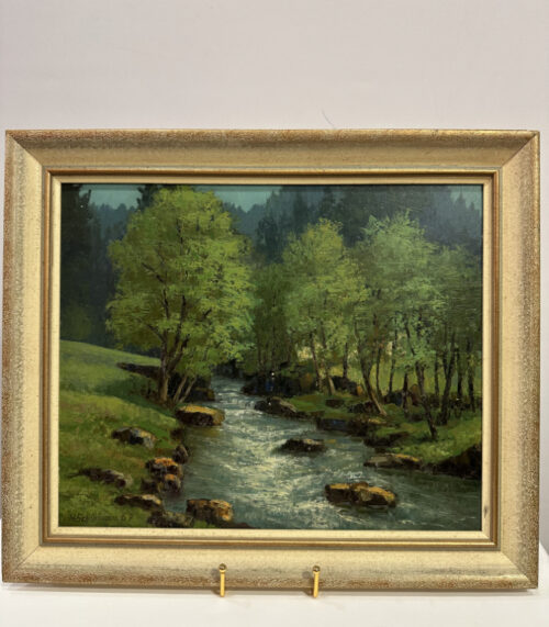 Ölgemälde Flusslandschaft mit Bäumen und Steinen von H. Schürmann 1967, 46 x 40 cm