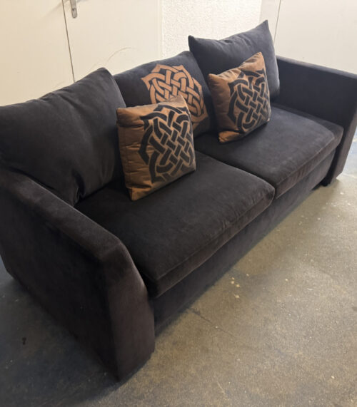 2er-Sofa von Bielefelder Werkstätten in dunkelbrauner Samt mit Zierkissen – Made in Germany