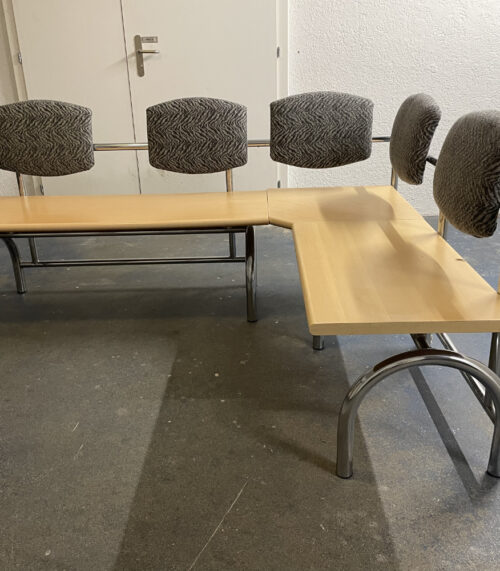 L-förmige Sitzbank mit gepolsterten Lehnen – stabile Metallkonstruktion und helle Holzsitzflächen
