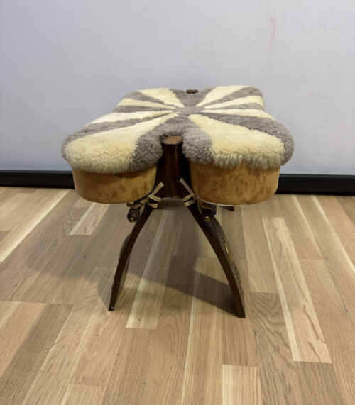 Klappbarer Hocker mit Lammfellbezug und Messingverzierungen