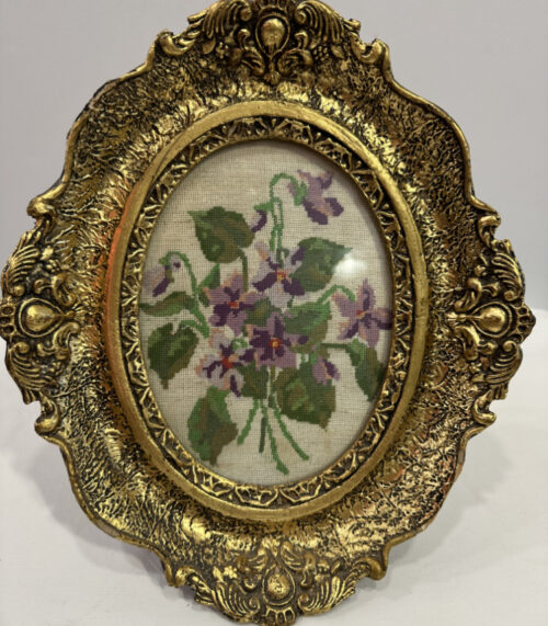 Ovales Stickbild Veilchen – Goldrahmen und Handarbeit von 1976