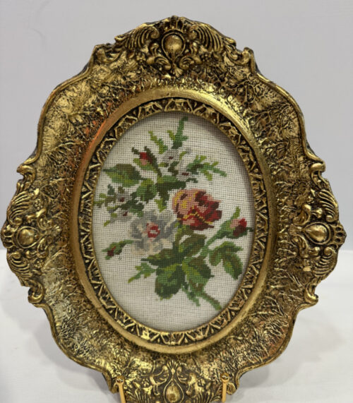 Ovales Stickbild Rosen – Goldrahmen und Handarbeit von 1976
