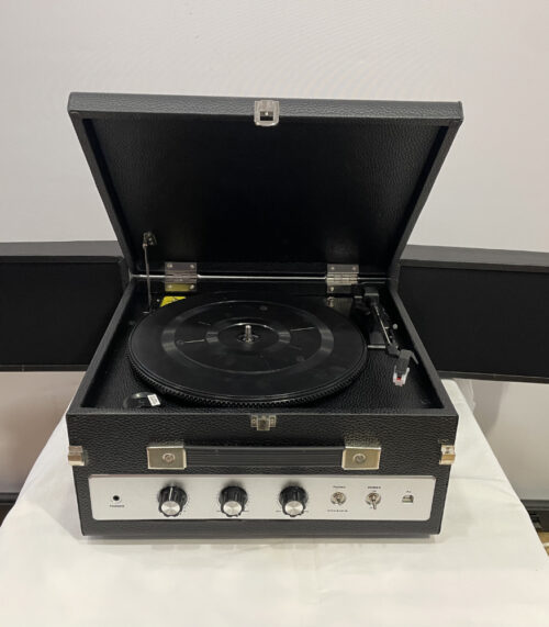 Nostalgischer Plattenspieler von „abc Home classic“ im Lederkoffer mit Lautsprechern und PC Anschluss