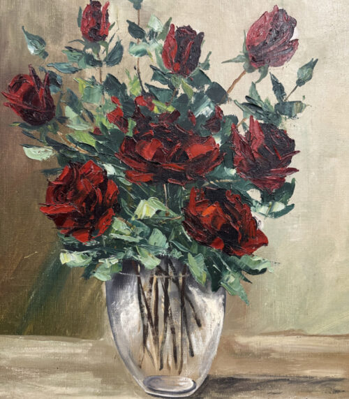 Ölgemälde mit Rosenstrauss in Glasvase – signiert, mit strukturiertem Pinselauftrag, 58 x 69 x 3cm