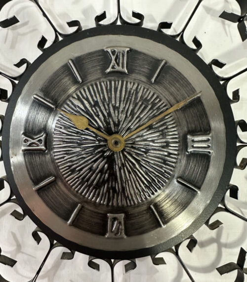Vintage-Wanduhr aus schwarzem Metall – mit römischen Zahlen und stilvollem Sonnendekor