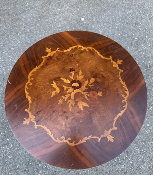 Kleiner runder Beistelltisch mit floralem Intarsienmuster – elegante Dreibein-Ausführung, Höhe 54 cm