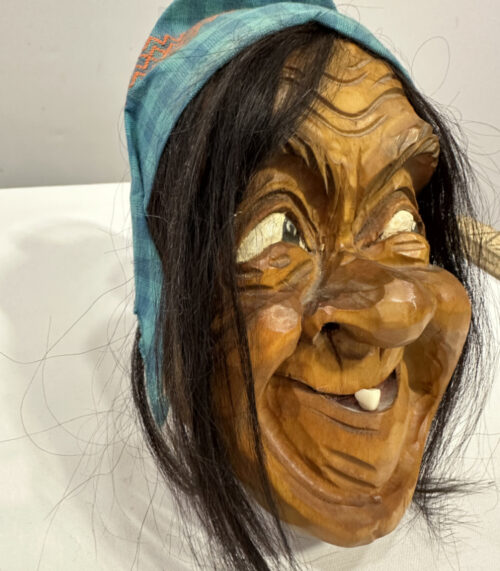 Geschnitzte Krienser Hexenmaske mit Kopftuch – signiert HZ 85