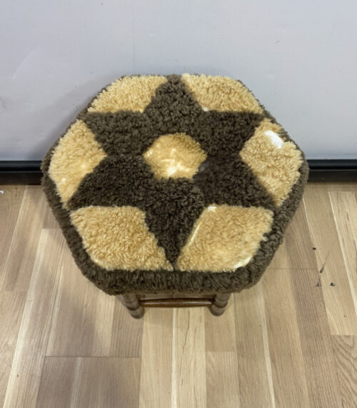 Vintage Hocker mit Holzgestell und wolligem Polster – Sechseckform