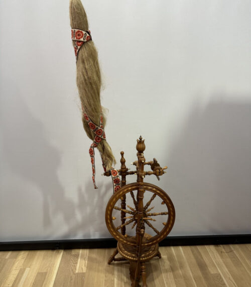 Antikes Spinnrad mit Intarsien und Nussbaumholz