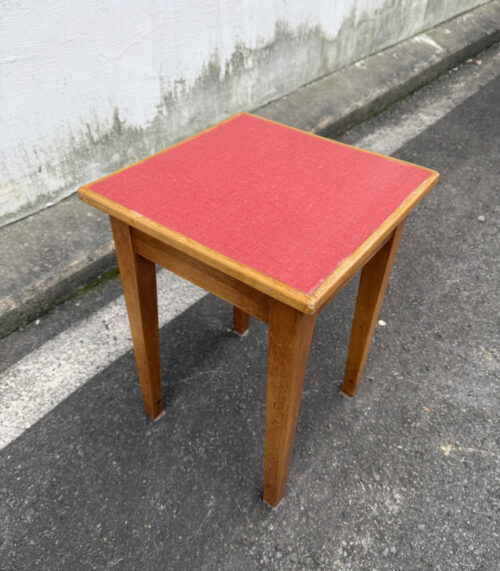 Vintage Holz Hocker mit roter Linoleum Sitzfläche ca. 1950er Jahre