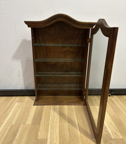 Vintage Vitrinenschrank aus Holz mit Glasböden und geschwungenem Aufsatz 1970er Jahre