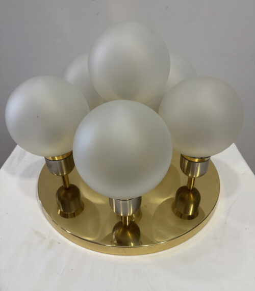 Vintage Mid Century Deckenlampe mit sechs Milchglas Kugeln auf Messingbasis ca. 1970er Jahre