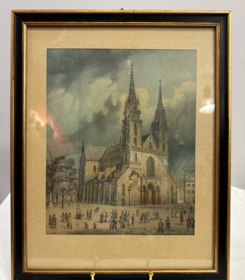 Kolorierte Original Lithographie um 1840 – Basler Münster mit belebter Platzszene