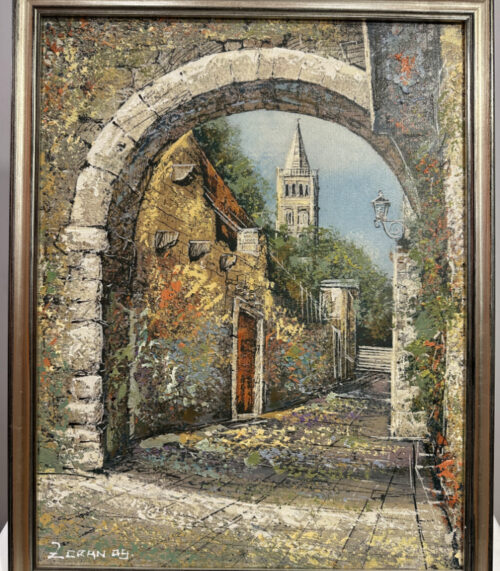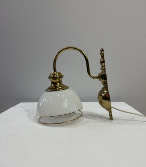 Klassische Wandleuchte mit Messingarm und Glasschirm, mit Goldrand, anschlussbereit