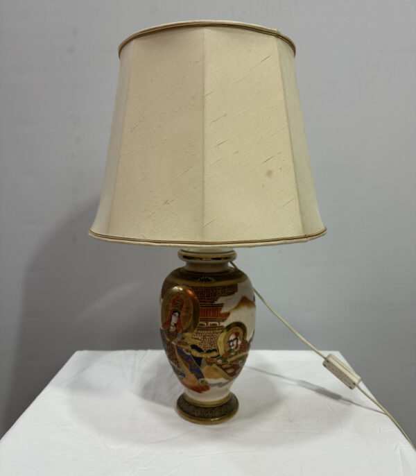 Vintage Satsuma Tischlampe aus Japan mit handbemalten Figuren und Stoffschirm