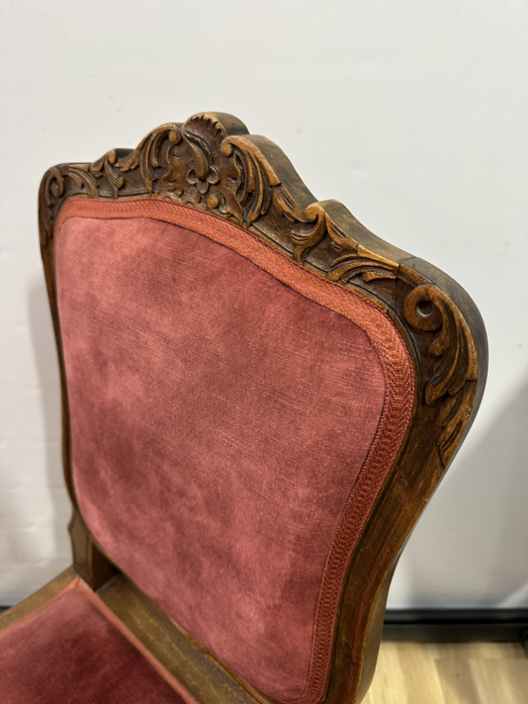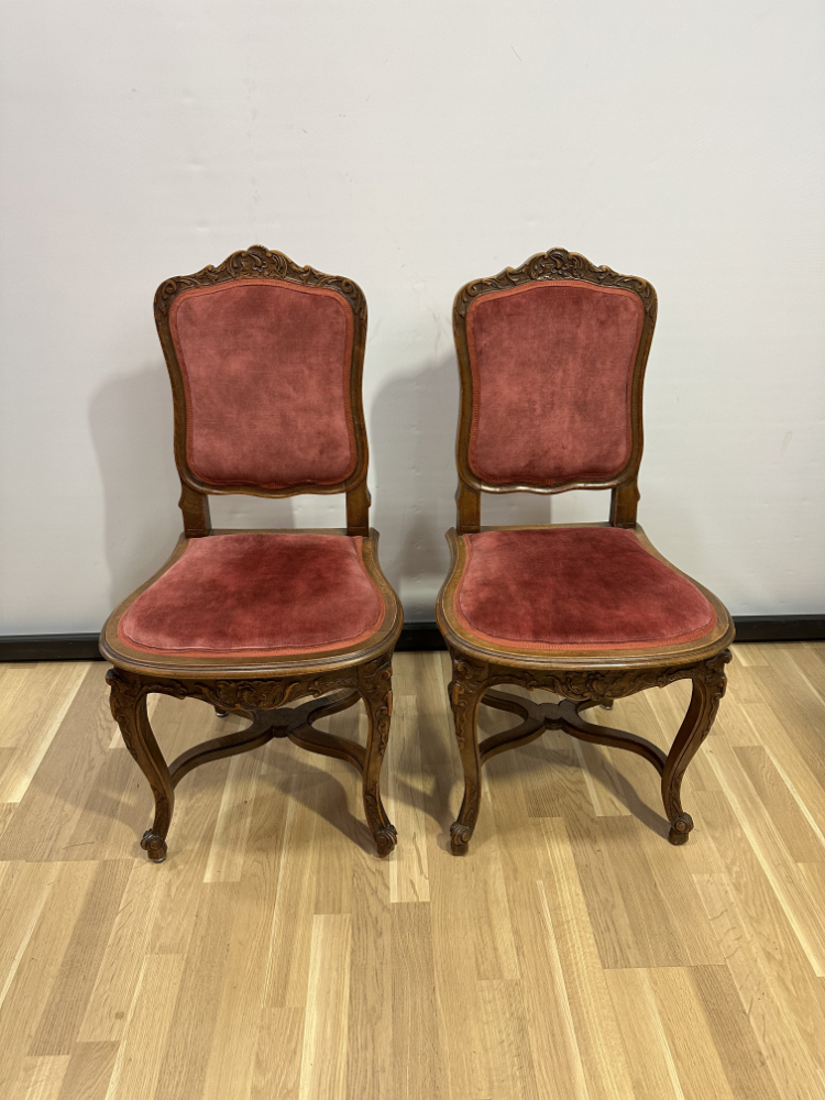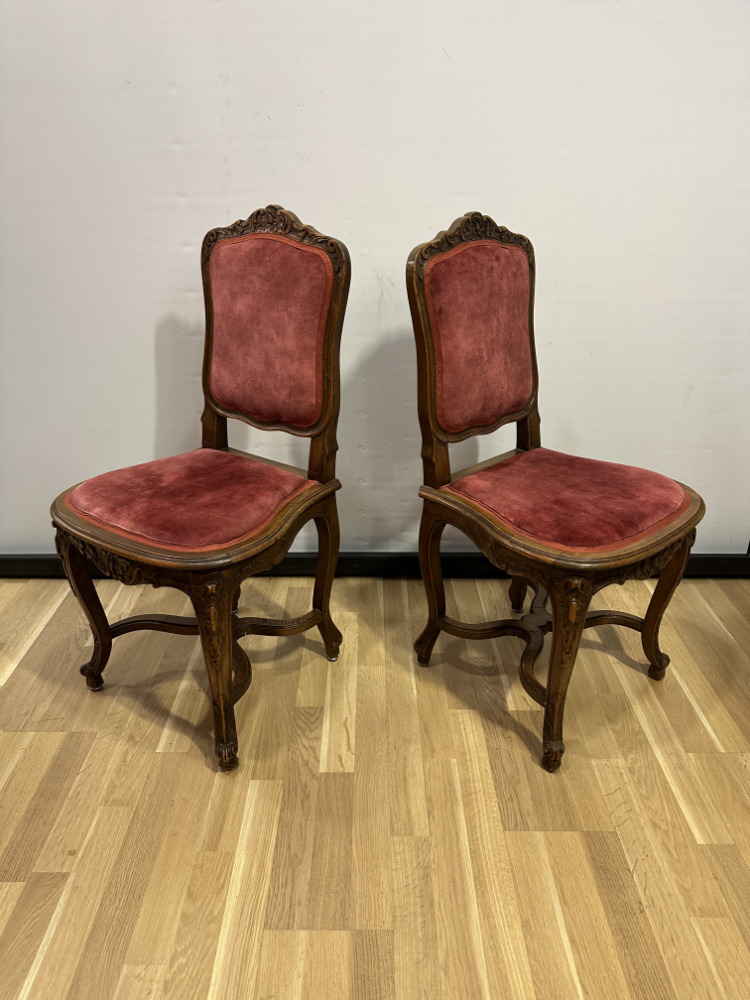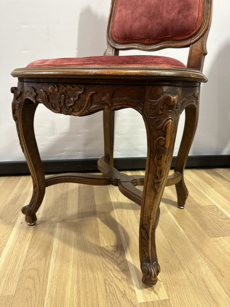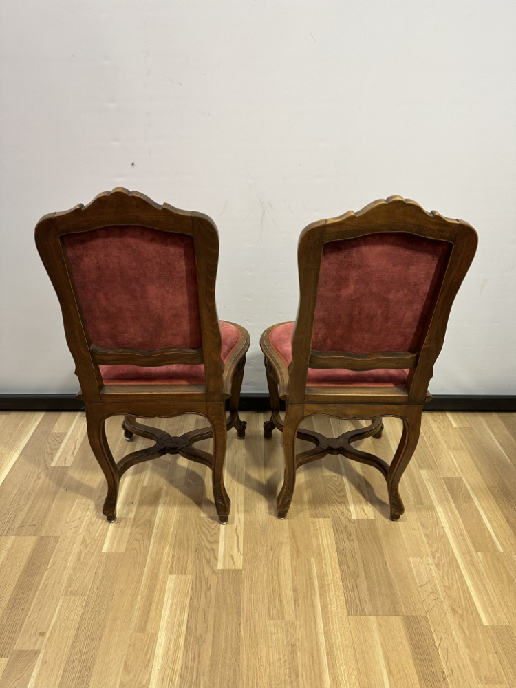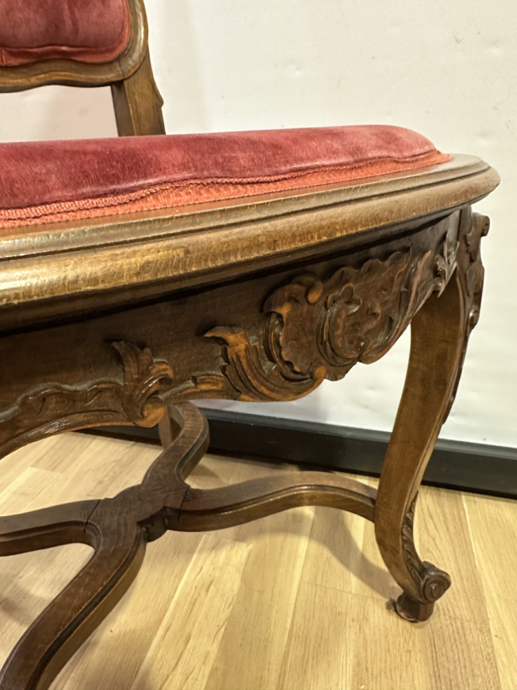 Dieses elegante Stuhl-Set im Stil Louis XV bringt französisches Lebensgefühl und kunstvolle Handwerkskunst in jeden Raum. Die geschwungenen Linien, floralen Schnitzereien und zarten Rundungen zeigen die typische Formensprache des 18. Jahrhunderts. Beide Stühle bestehen aus massivem Nussbaumholz und sind mit einem roten Samtstoff bezogen, der weich schimmert und die feinen Holzornamente betont.