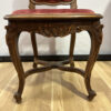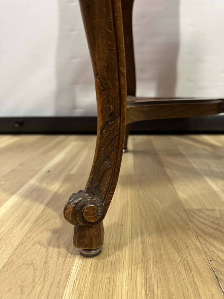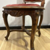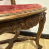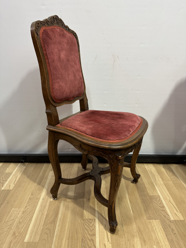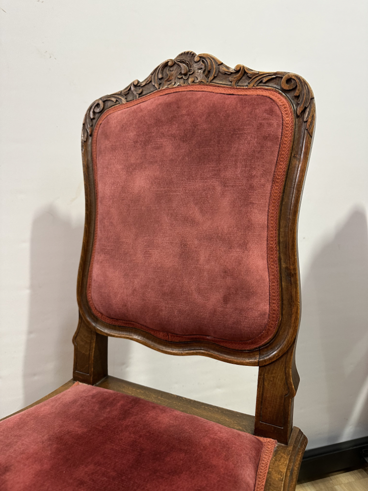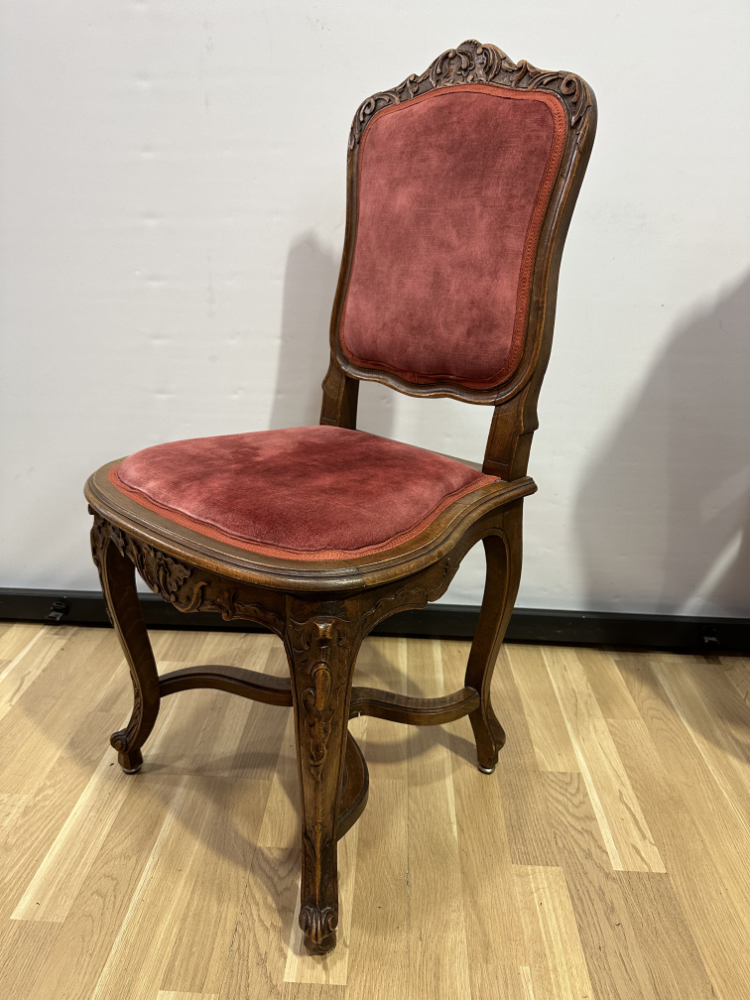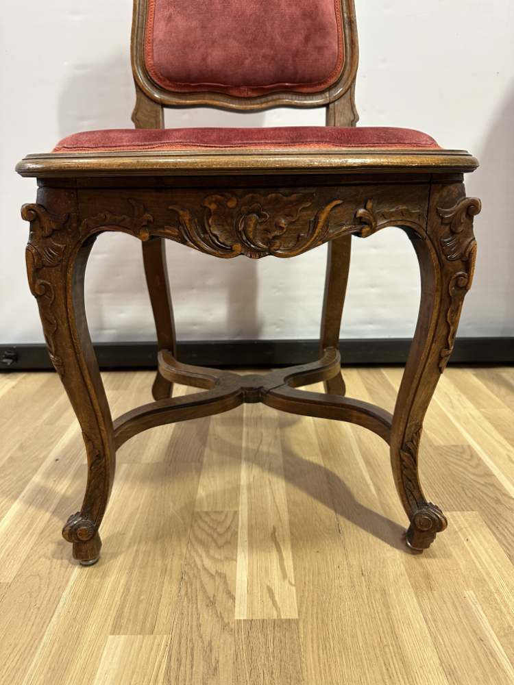 Dieses elegante Stuhl-Set im Stil Louis XV bringt französisches Lebensgefühl und kunstvolle Handwerkskunst in jeden Raum. Die geschwungenen Linien, floralen Schnitzereien und zarten Rundungen zeigen die typische Formensprache des 18. Jahrhunderts. Beide Stühle bestehen aus massivem Nussbaumholz und sind mit einem roten Samtstoff bezogen, der weich schimmert und die feinen Holzornamente betont.