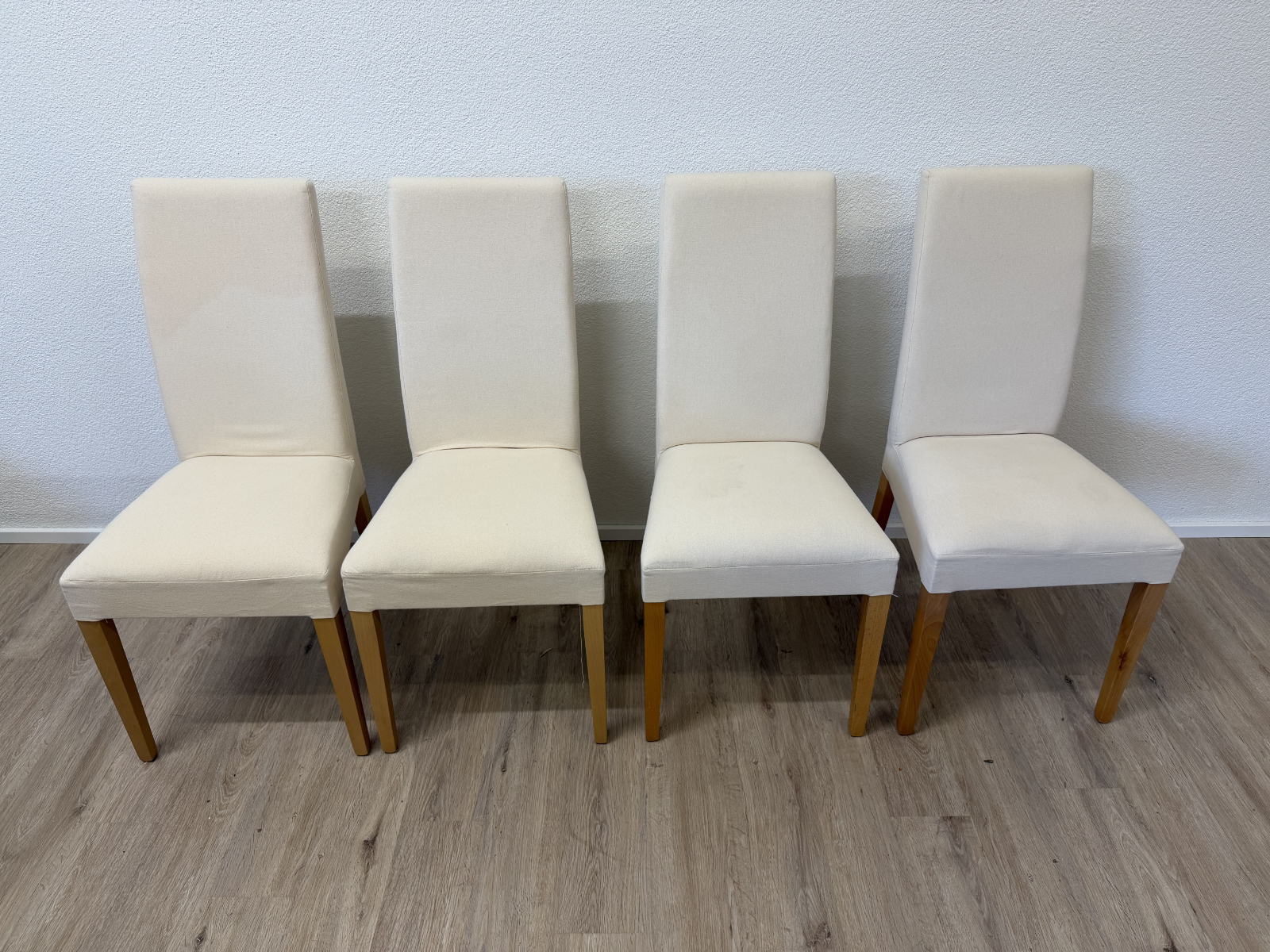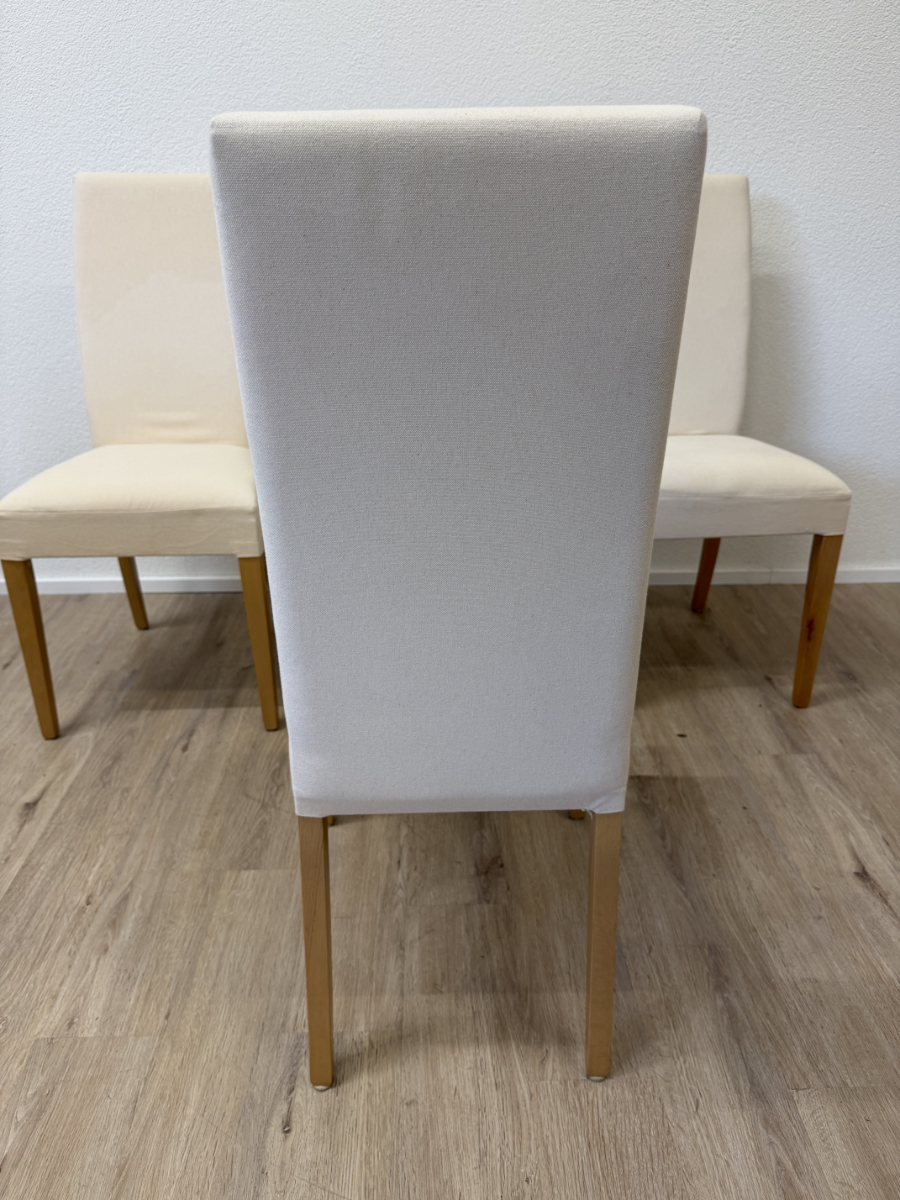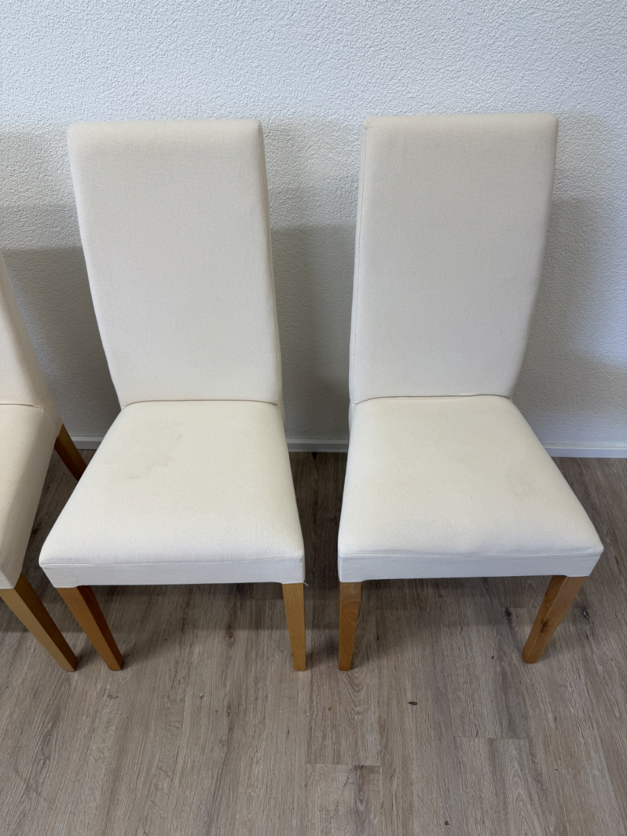 4 passende Stühle für den Esstisch, schlicht gehalten und angenehm gepolstert. Der cremefarbene Stoff wirkt ruhig und hell, die schlanken Holzbeine bringen Wärme in den Raum. Praktisch im Alltag: Durch die klare Form lassen sich die Stühle sehr gut mit Hussen kombinieren, ideal wenn du den Look je nach Saison oder Anlass schnell verändern willst. 1 Stuhl mit leichten Gebrauchsspuren am Bezug (siehe Foto).