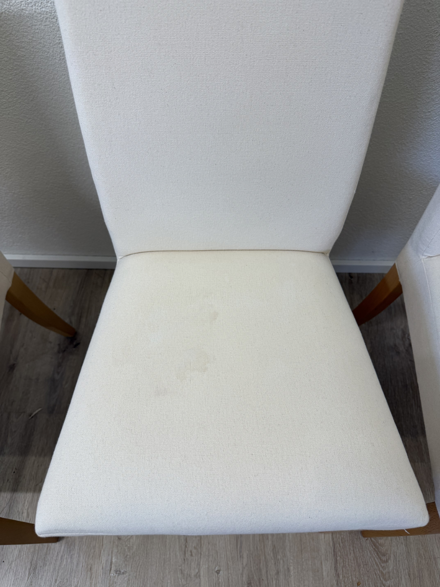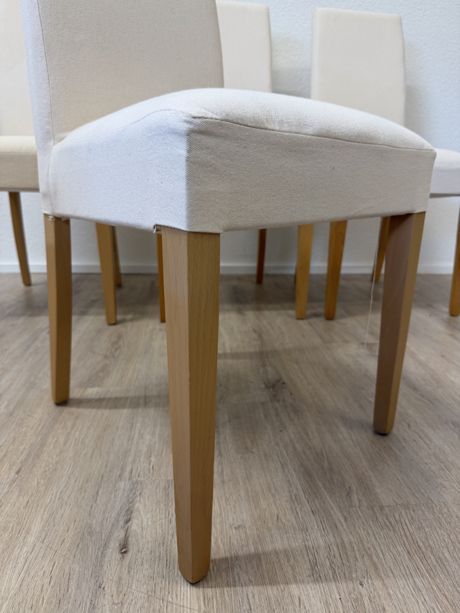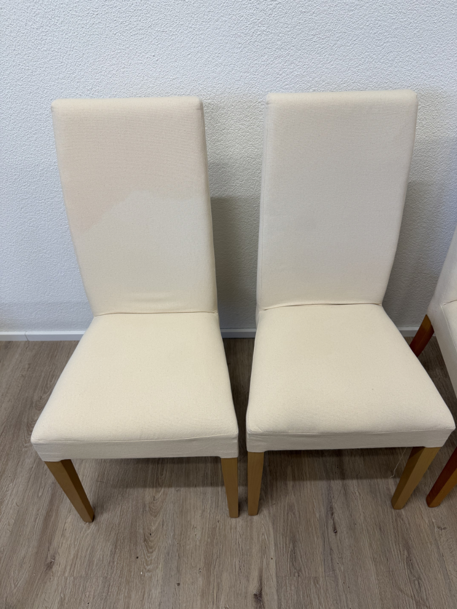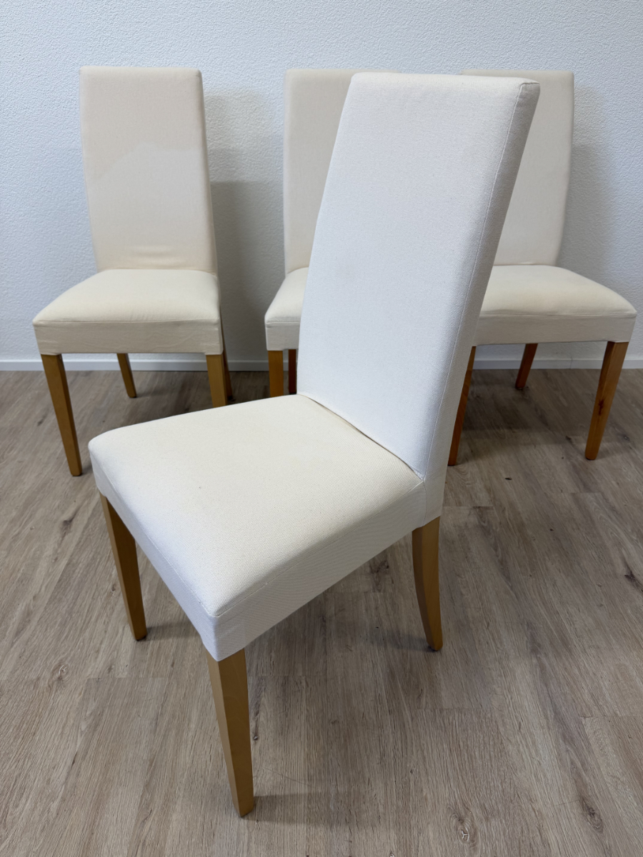 4 passende Stühle für den Esstisch, schlicht gehalten und angenehm gepolstert. Der cremefarbene Stoff wirkt ruhig und hell, die schlanken Holzbeine bringen Wärme in den Raum. Praktisch im Alltag: Durch die klare Form lassen sich die Stühle sehr gut mit Hussen kombinieren, ideal wenn du den Look je nach Saison oder Anlass schnell verändern willst. 1 Stuhl mit leichten Gebrauchsspuren am Bezug (siehe Foto).