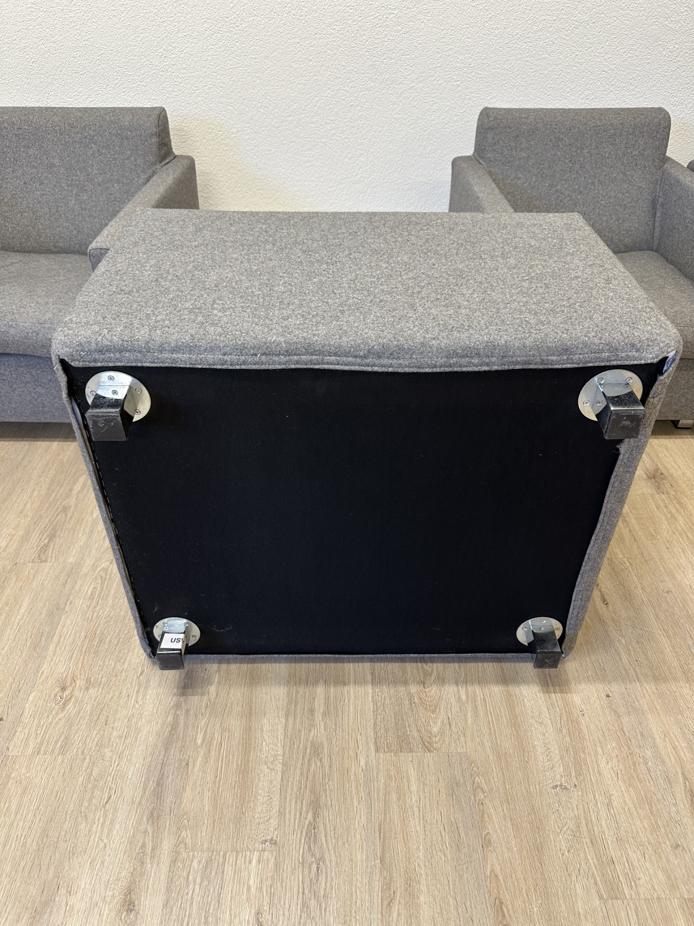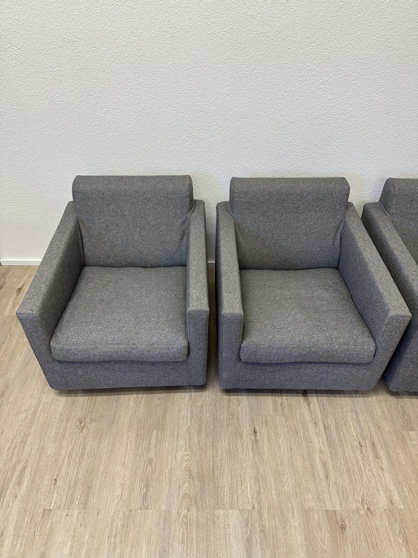 4 identische Lounge Sessel in einem ruhigen Grauton, sauber verarbeitet und angenehm kompakt. Die Form ist bewusst geradlinig, mit breiten Armlehnen und einer tiefen Sitzfläche zum Zurücklehnen. Der Filzstoffbezug wirkt hochwertig und fühlt sich warm an. Unter dem grauen Bezug sitzt ein weisser Innenstoff, wie auf dem Foto sichtbar. Das ist praktisch, falls man den Bezug zum Reinigen einmal abnehmen oder lüften möchte. Unten sorgen kurze Metallfüsse für stabilen Halt und heben den Sessel leicht an.