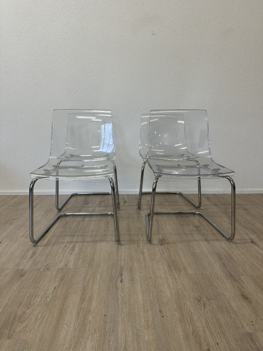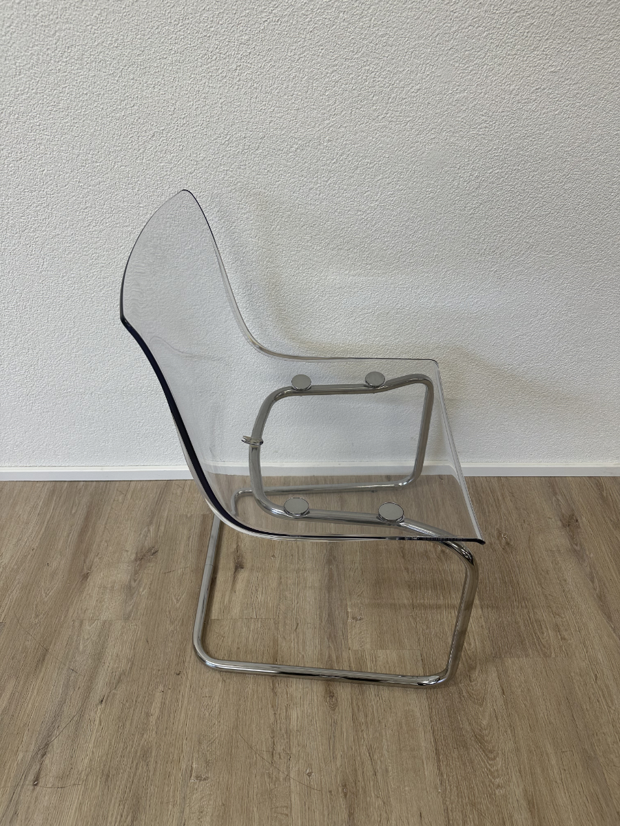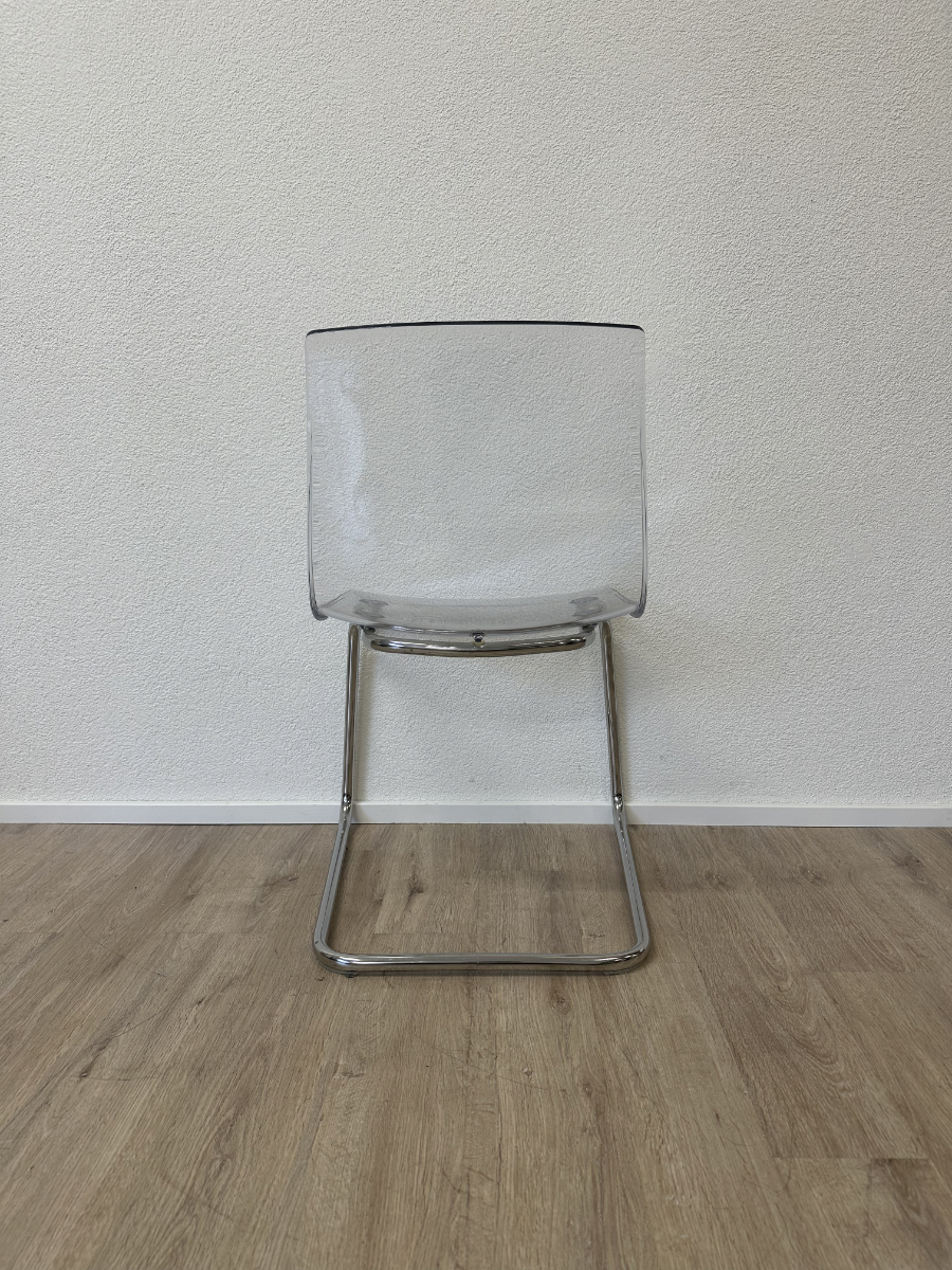 Klare Linien, transparente Sitzschale und ein verchromtes Freischwinger-Gestell. Diese TOBIAS Stühle von IKEA, entworfen von Carl Öjerstam, wirken leicht und modern. Durch die transparente Ausführung passen sie optisch fast in jeden Raum und nehmen kaum visuelle Fläche ein.