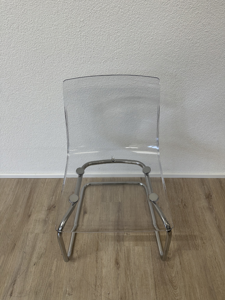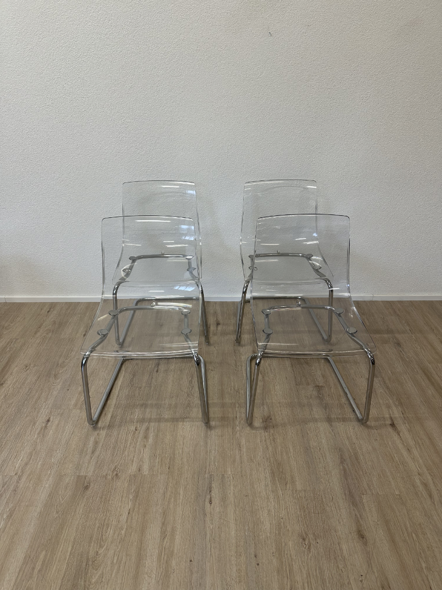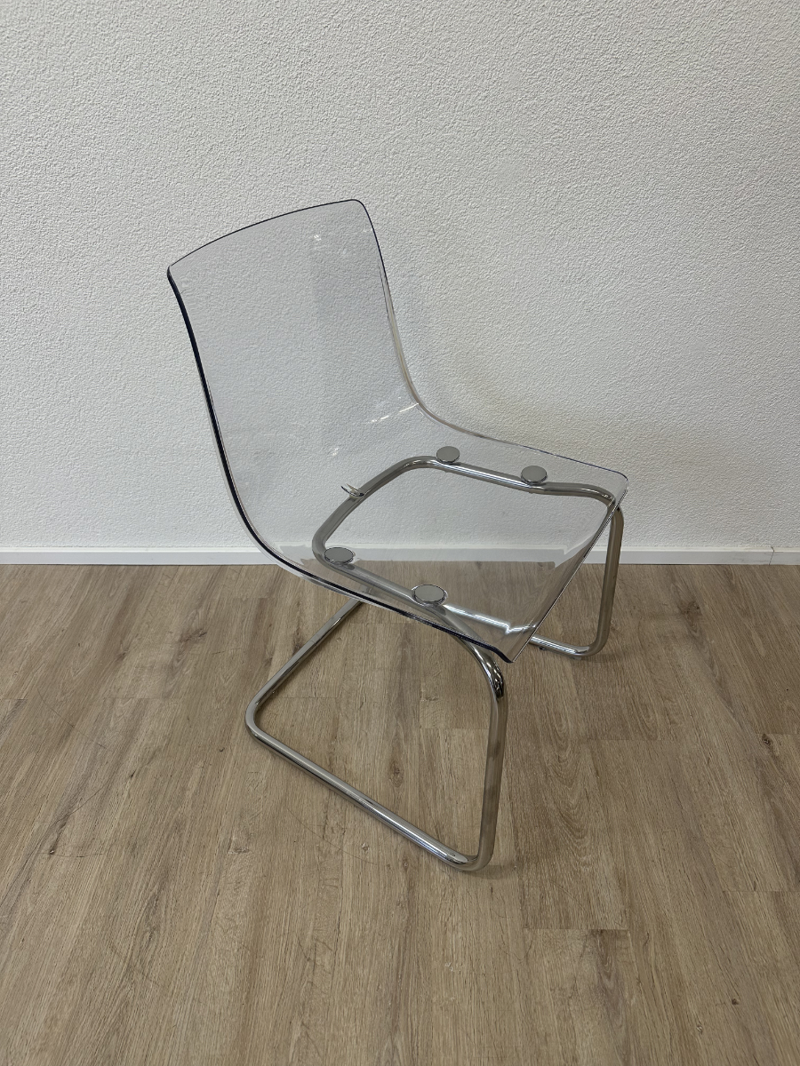 Klare Linien, transparente Sitzschale und ein verchromtes Freischwinger-Gestell. Diese TOBIAS Stühle von IKEA, entworfen von Carl Öjerstam, wirken leicht und modern. Durch die transparente Ausführung passen sie optisch fast in jeden Raum und nehmen kaum visuelle Fläche ein.