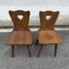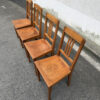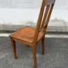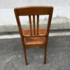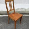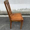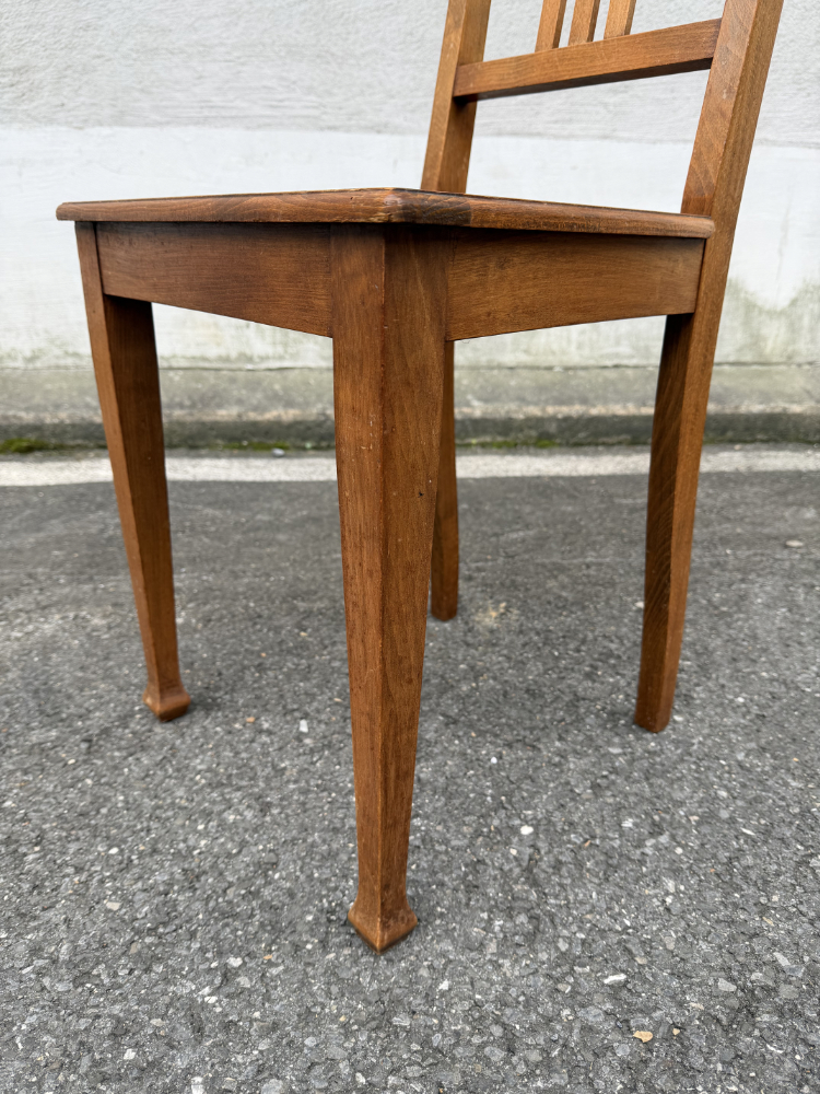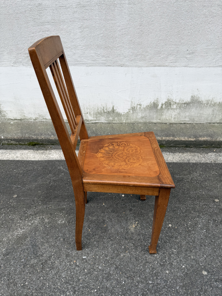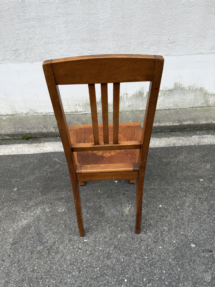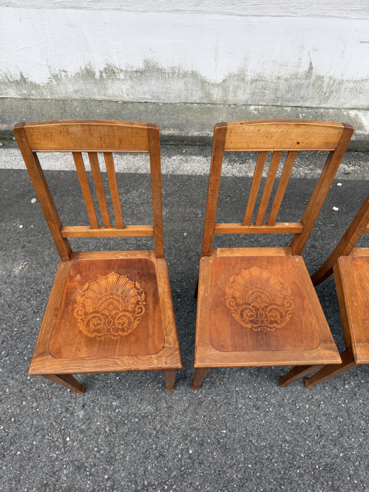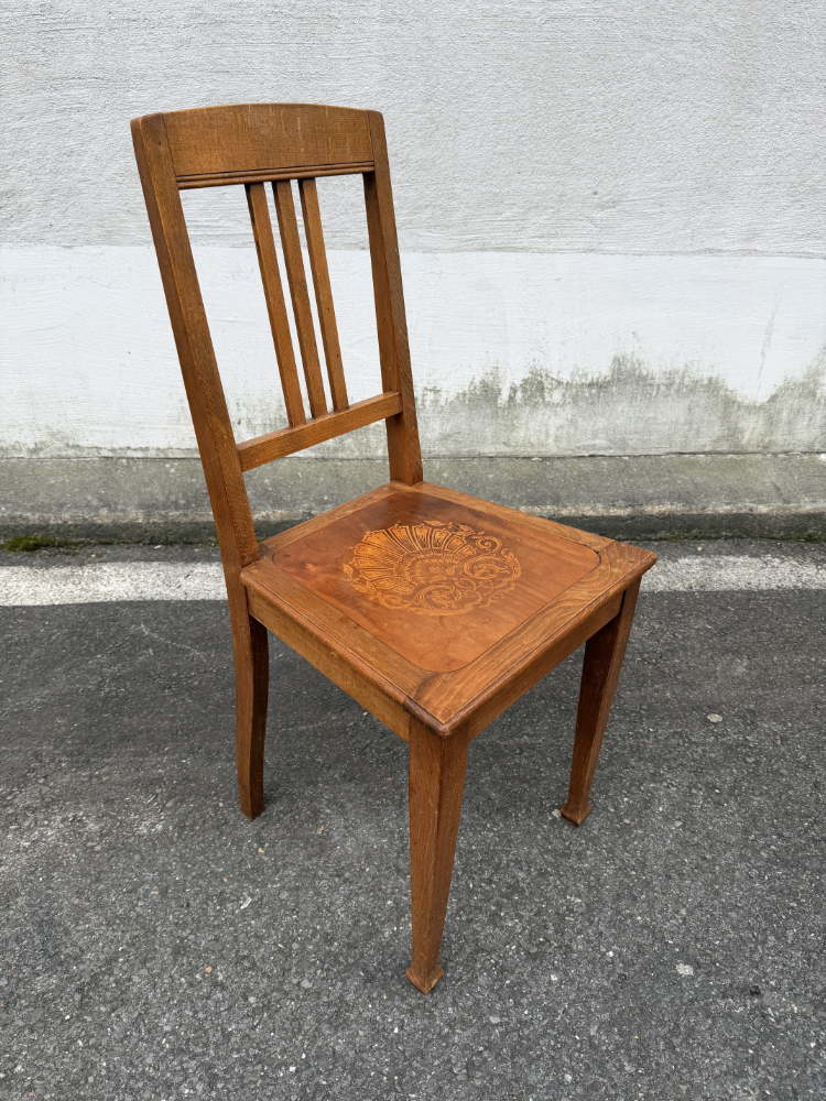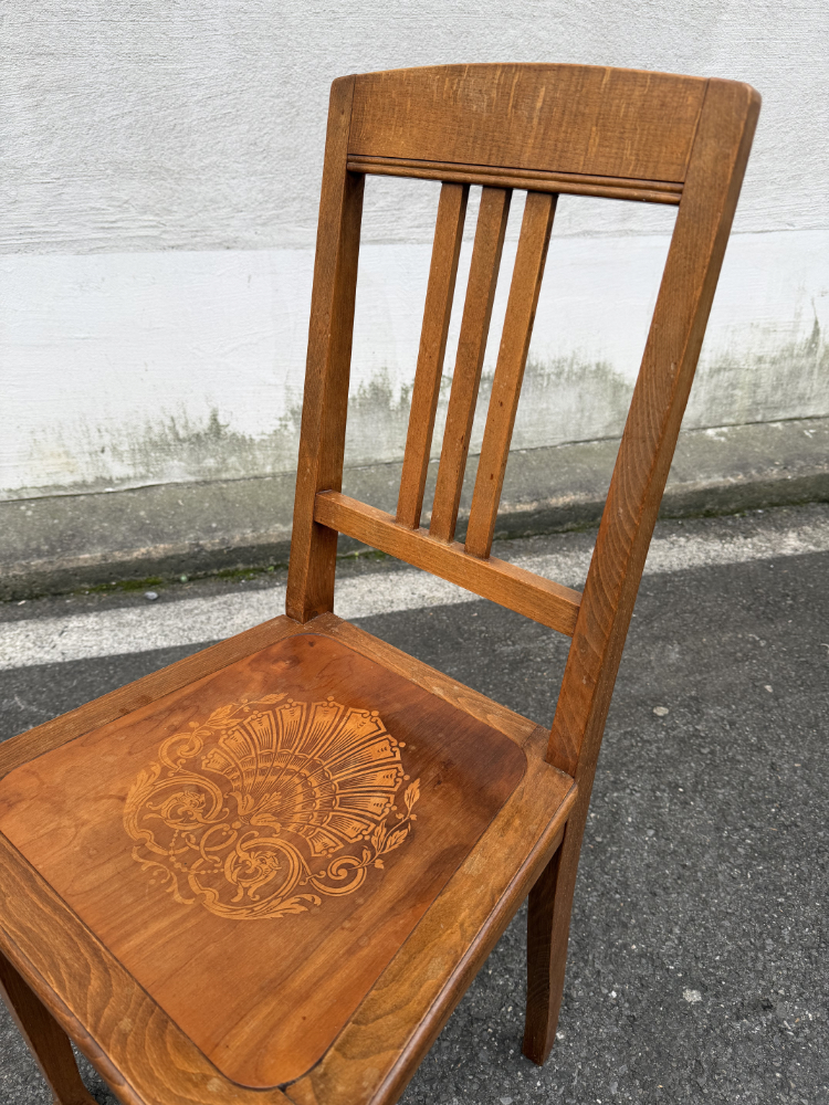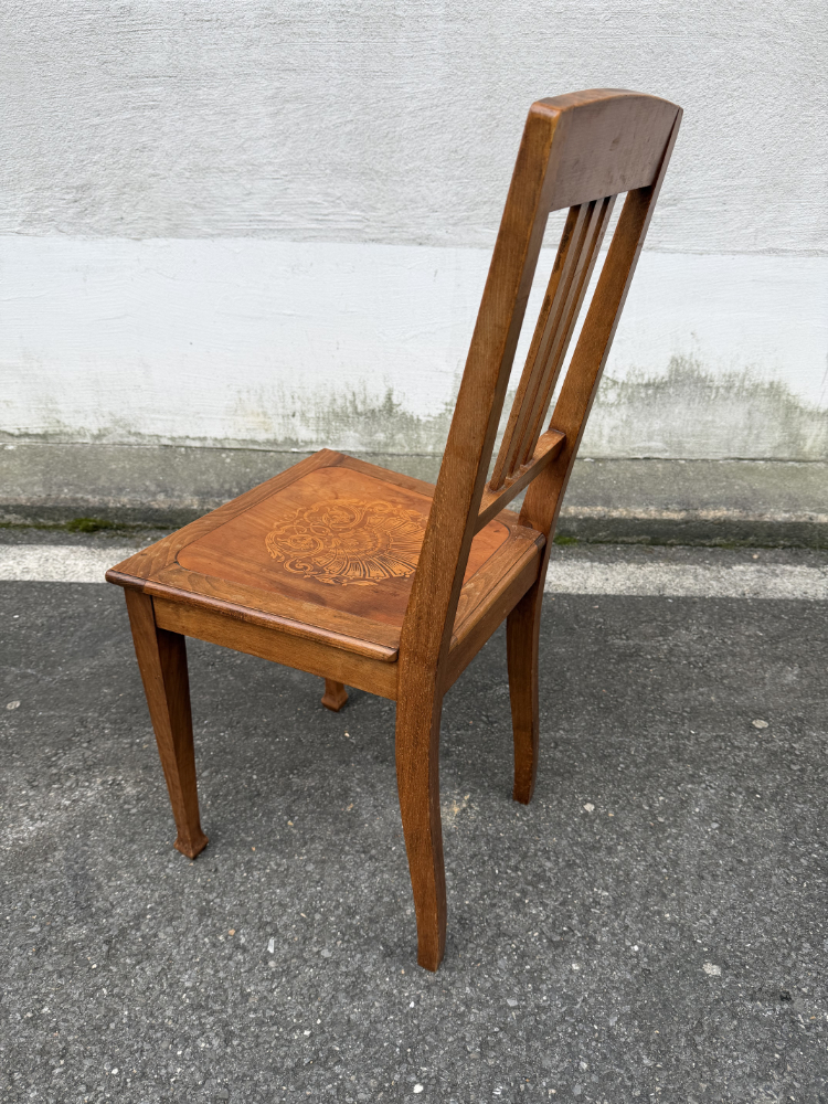 Diese vier charaktervollen Stühle stammen aus der Zeit des frühen 20. Jahrhunderts und zeigen typische Jugendstil-Elemente in Form und Dekor. Gefertigt aus massivem Holz, bestechen sie durch eine elegante, gerade Linienführung und eine fein gearbeitete Intarsie auf der Sitzfläche – ein florales Fächer-Motiv, das Wärme und Handwerkskunst ausstrahlt. Die hohe, schmale Rückenlehne mit vertikalen Streben sorgt für eine schlanke Silhouette und angenehmen Sitzkomfort.