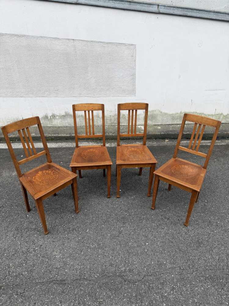 4er-Set Jugendstil Holzstühle mit Intarsien – um 1910