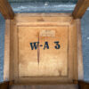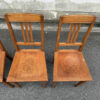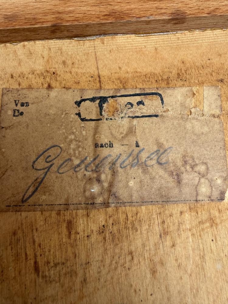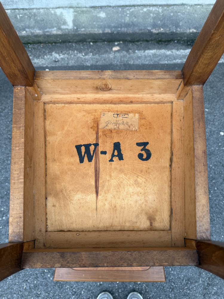 Die Unterseite trägt die Markierung „W-A 3“ und ein altes Versandetikett mit der Aufschrift „Geuensee“. Die Stühle sind stabil, solide gearbeitet und zeigen eine gleichmässige Alterspatina, die den authentischen Charakter unterstreicht.