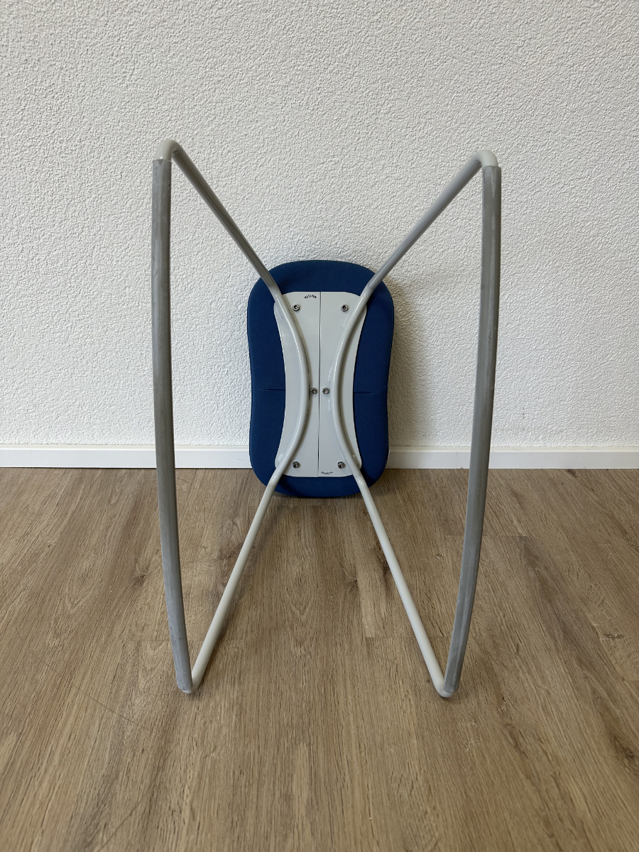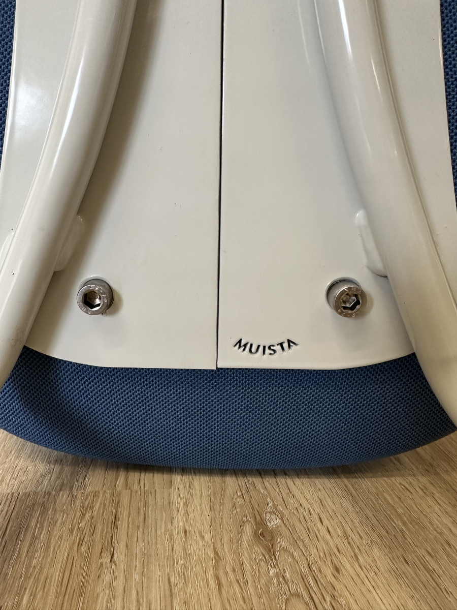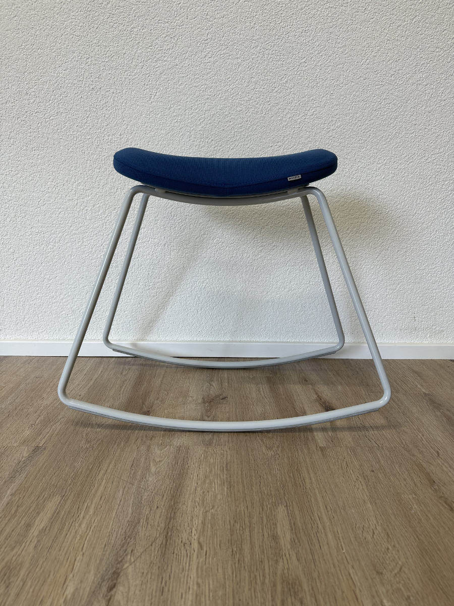 Klare Linien, funktionales Design und eine überraschend bequeme Sitzfläche. Dieser originale Sitzhocker von Muista zeigt skandinavisch geprägtes Design mit einem stabilen Metallkufengestell in Blau und einer ergonomisch geformten, gepolsterten Sitzfläche. Der blaue Stoffbezug wirkt ruhig und modern zugleich, während die geschwungene Form des Sitzes für angenehmen Halt sorgt. Unterseitig ist die Konstruktion sauber verschraubt und mit Herstellerprägung versehen.