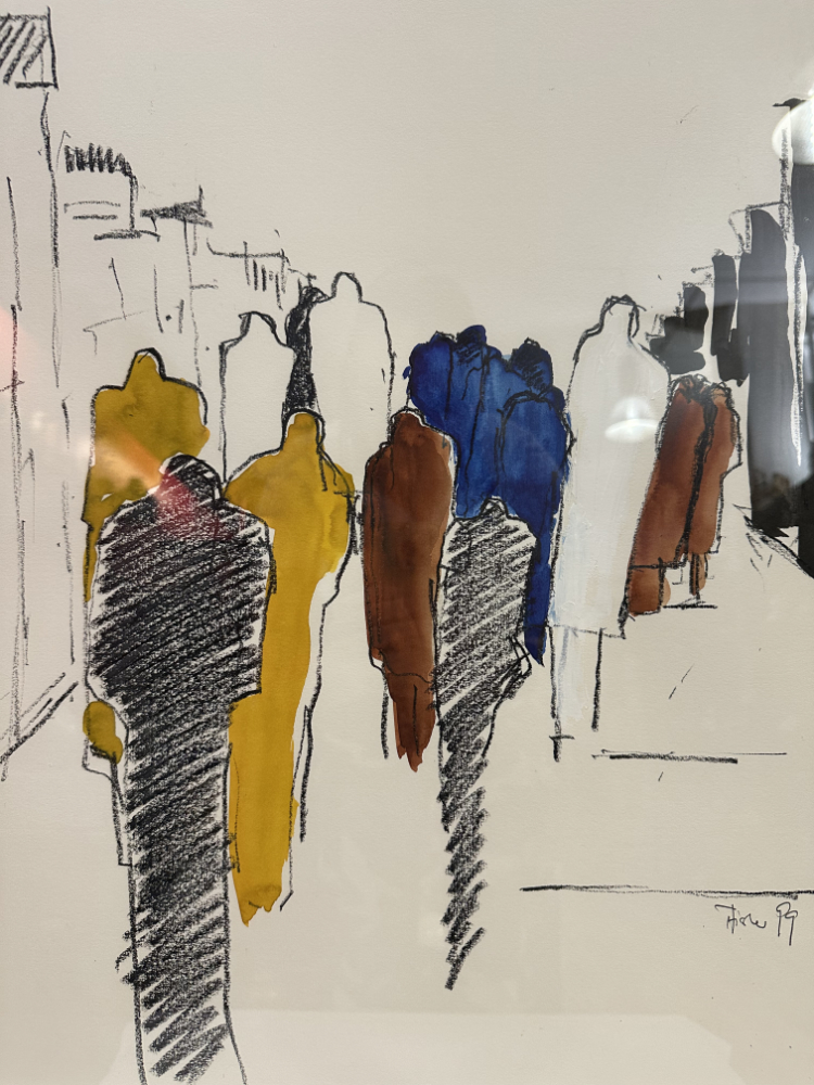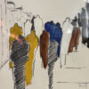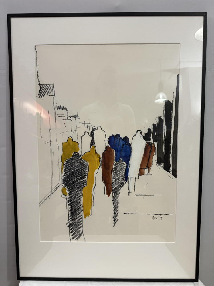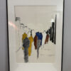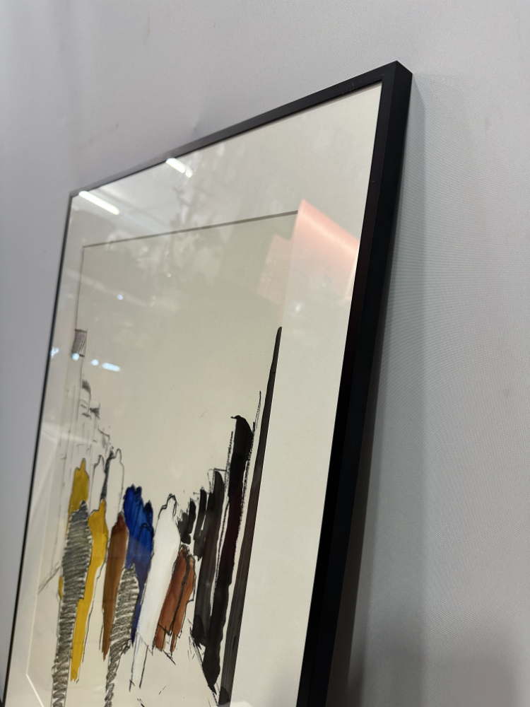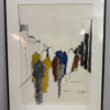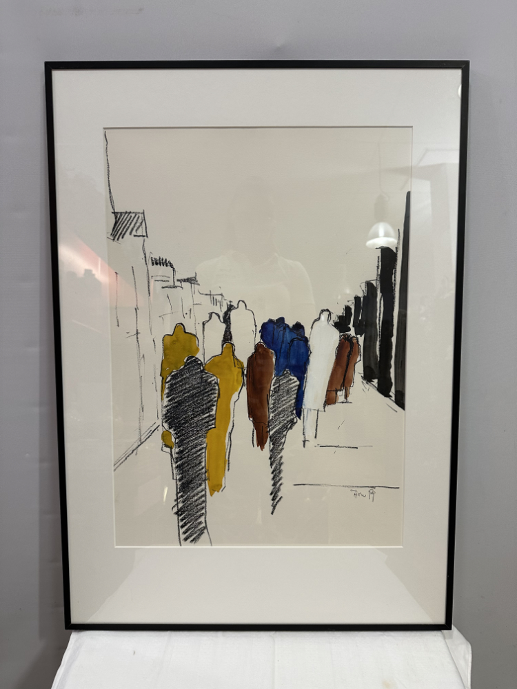 Lebendige Farbakzente und rhythmische Linien verleihen dieser Arbeit aus dem Jahr 1997 eine eindrucksvolle Dynamik. Die Szene zeigt eine Menschengruppe in städtischer Umgebung – reduziert auf Silhouetten, Bewegung und Atmosphäre. Mit Tusche gezeichnet und in Gouache koloriert, entsteht ein spannendes Wechselspiel aus Struktur und Fläche. Der abstrakt-figurative Stil verbindet urbane Energie mit künstlerischer Reduktion.