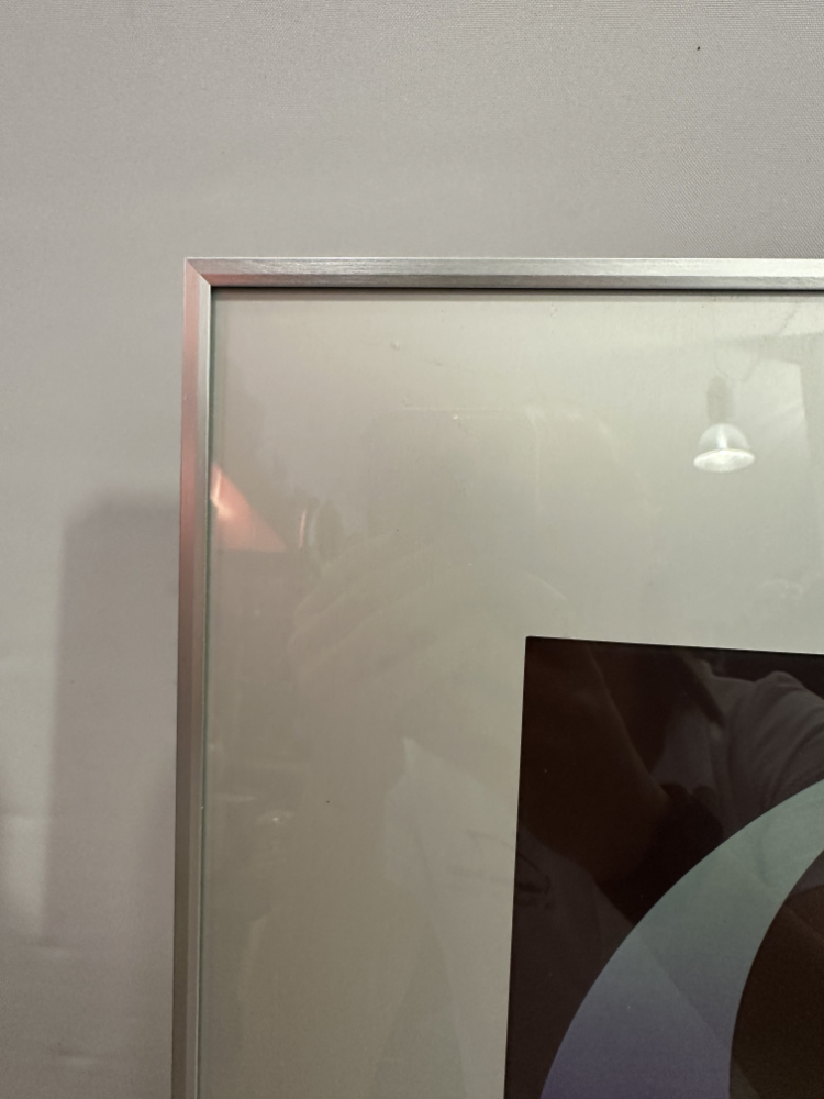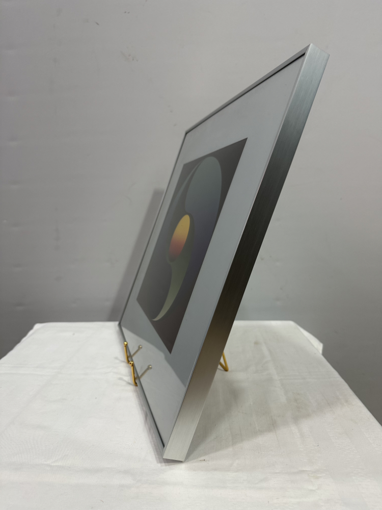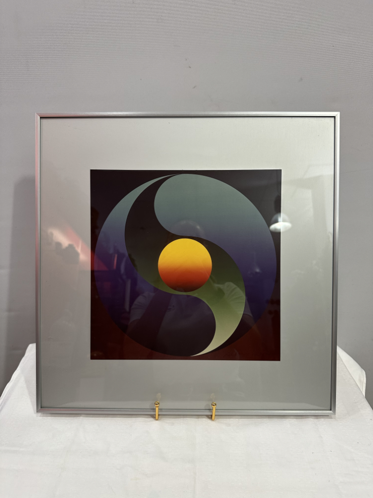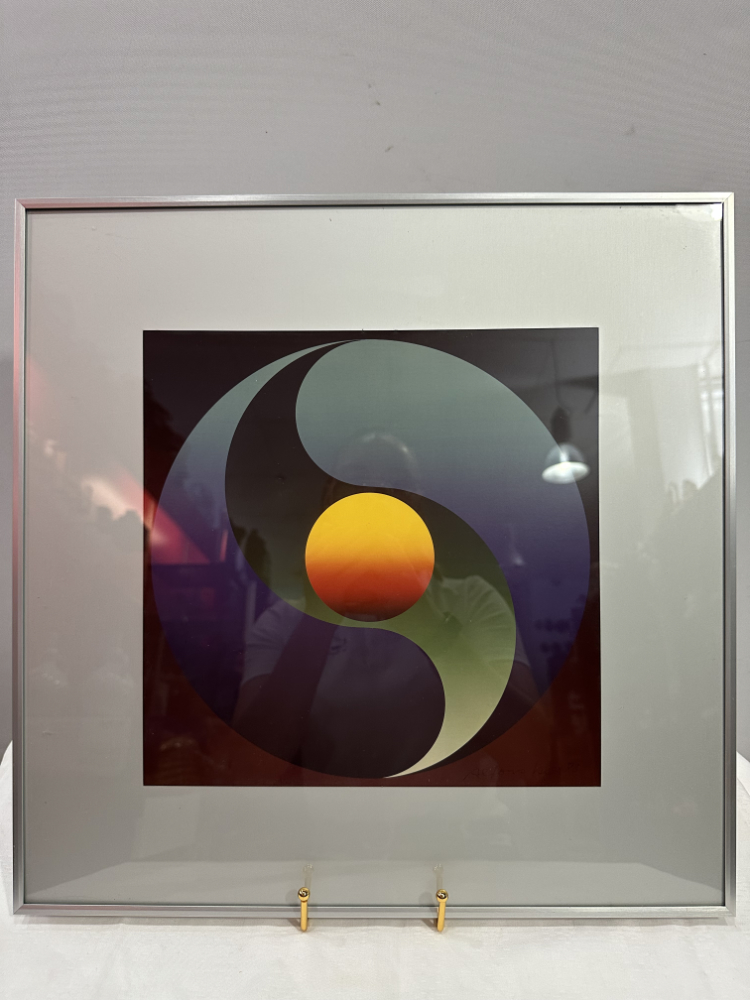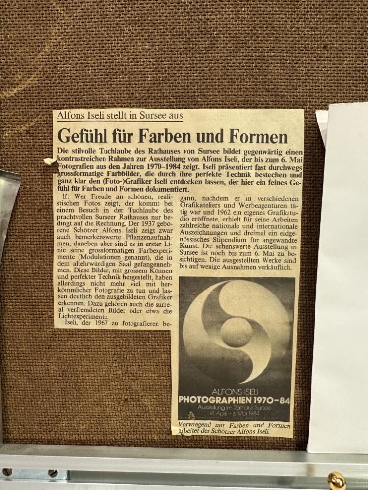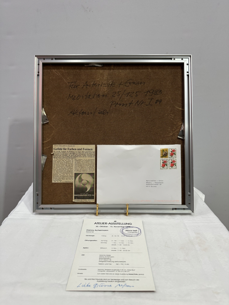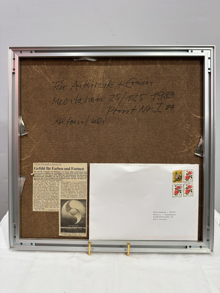 Ein faszinierendes Werk des Schweizer Künstlers Alfons Iseli (1937–2003): „Meditation“, Farbfotografie aus dem Jahr 1983, nummeriert 25/125 und mit einer persönlichen Widmung auf der Rückseite: „Für Antoinette + Erwin“. Das Bild stammt aus Iselis Schaffensperiode zwischen 1970 und 1984, in der er Farbe, Licht und grafische Form zu einer harmonischen Einheit verband.