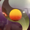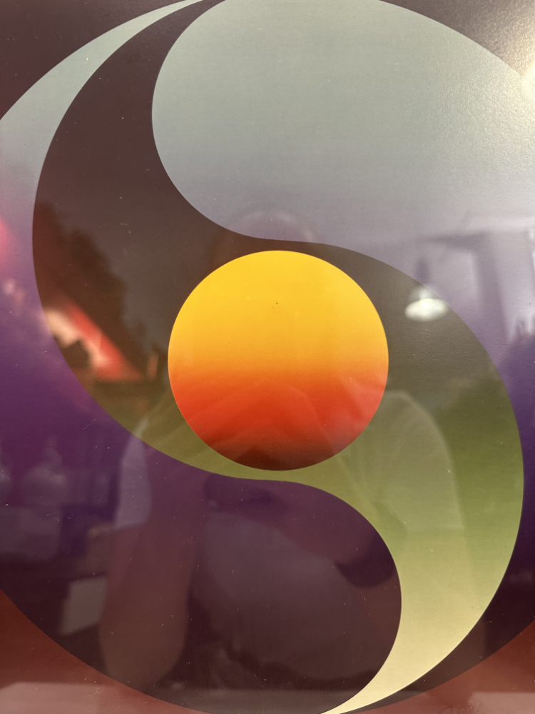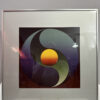 Im Zentrum steht eine kreisförmige Komposition in Gelb, Orange und tiefem Violett, die wie eine Sonne in Balance schwebt – ein typisches Motiv für Iselis meditative Farbmodulationen. Durch die weichen Übergänge und präzise Symmetrie wirkt das Werk fast schwebend und zieht den Blick in seine Tiefe.