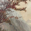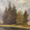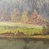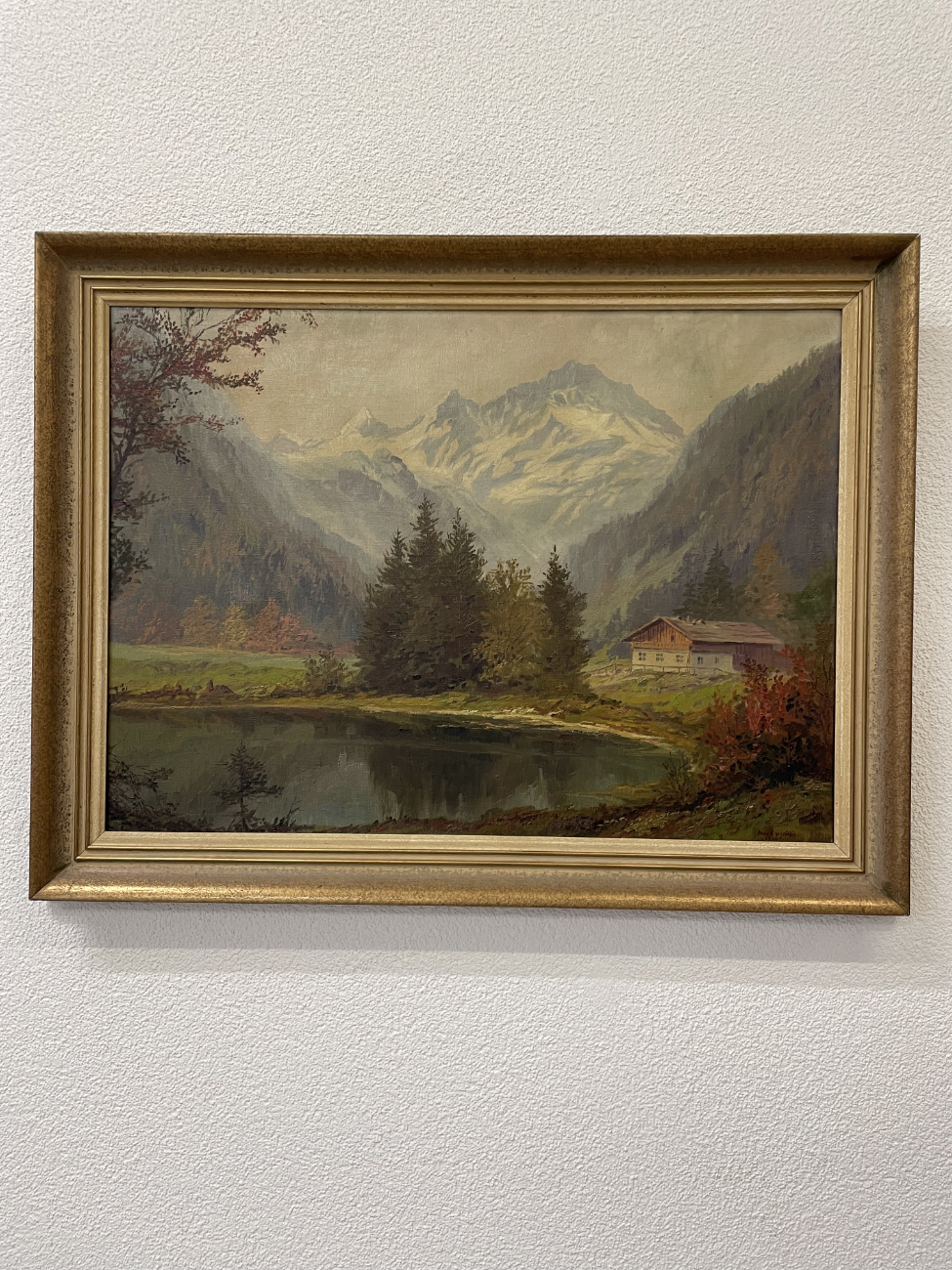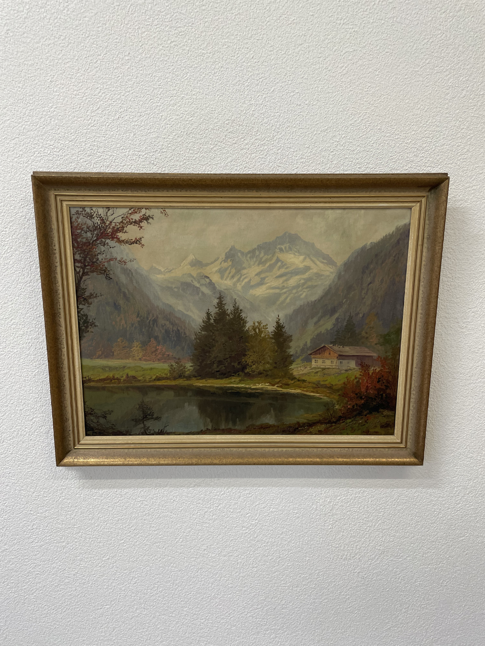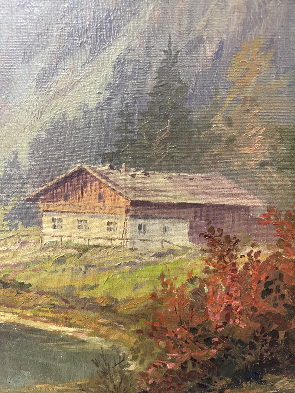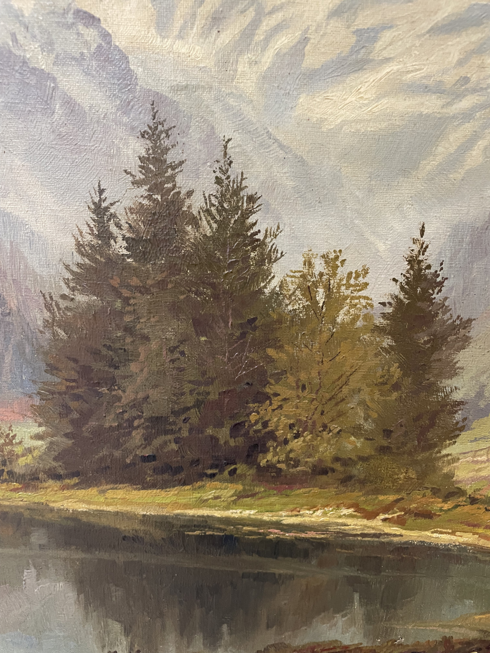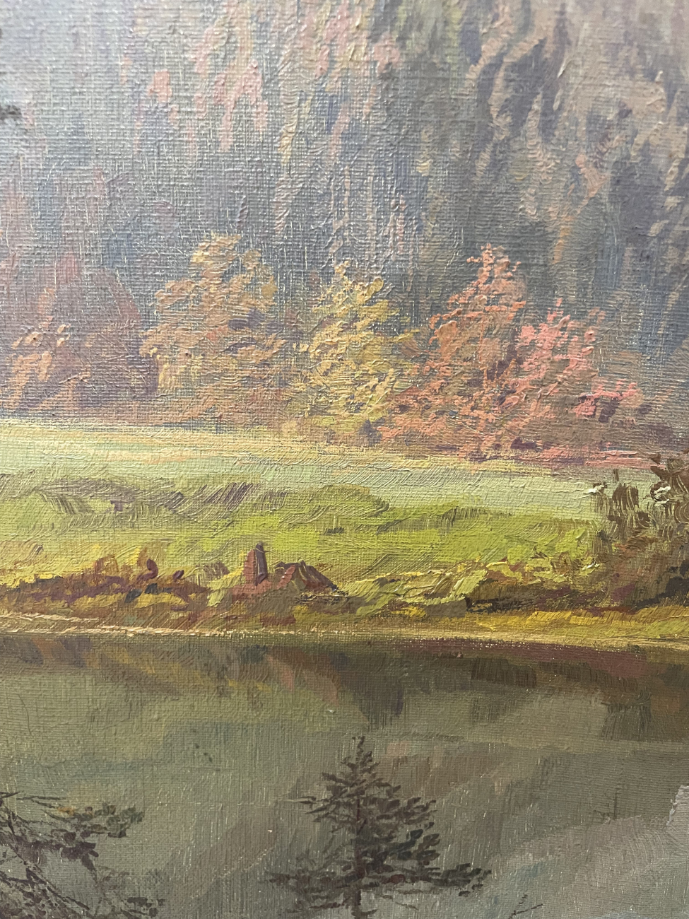 87 x 67 cm pure Bergstimmung: Vorne ein ruhiger See mit Spiegelung, dahinter eine weite Talöffnung mit dunklen Tannen, goldenen Herbstbäumen und einem Bauernhaus am Ufer. Im Hintergrund liegen die Gipfel in hellen, fast nebligen Schichten, so wie man es aus einem kühlen Morgen in den Alpen kennt. Die Farben sind warm, aber nicht knallig, und der sichtbare Pinselstrich gibt dem Bild Leben und Tiefe.