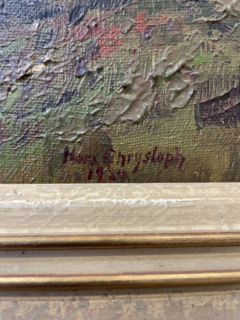 Unten rechts signiert und datiert: Hans Chrystoph, 1980. Der goldfarbene Rahmen passt super zum Motiv und lässt das Gemälde sofort fertig wirken, aufhängen und geniessen.