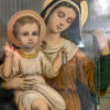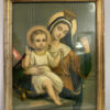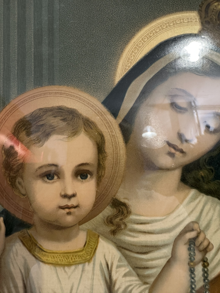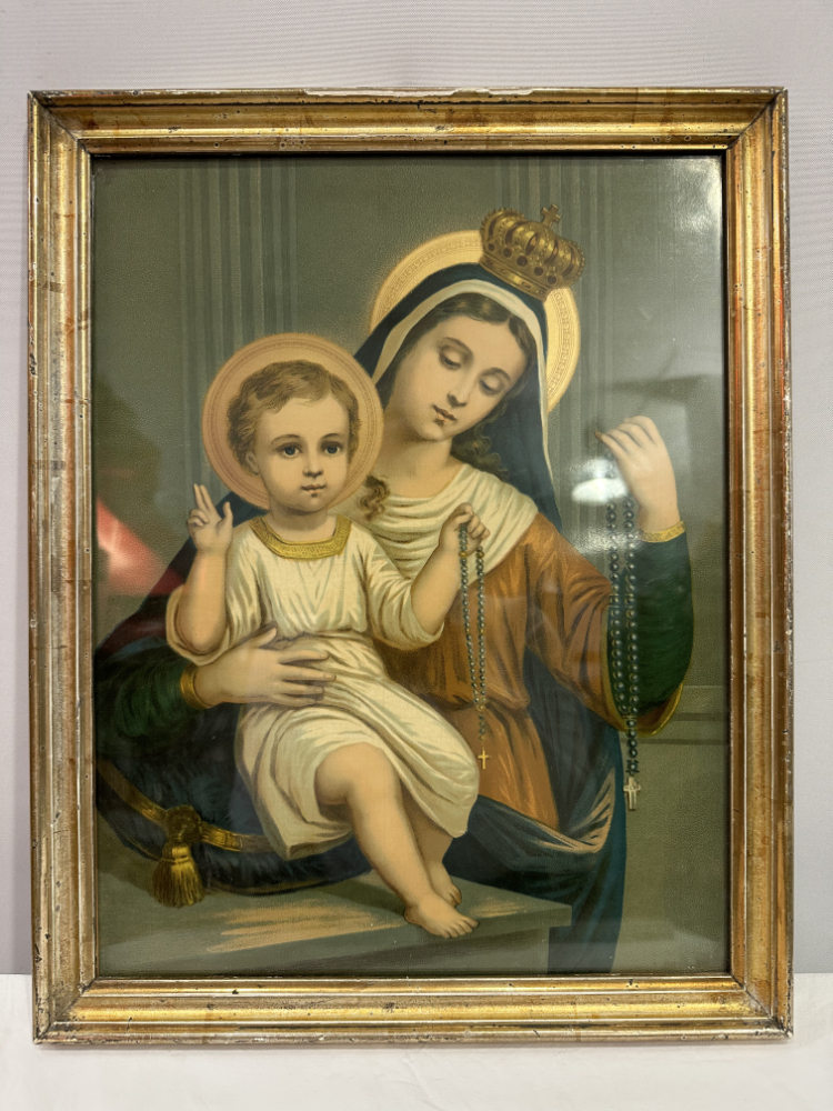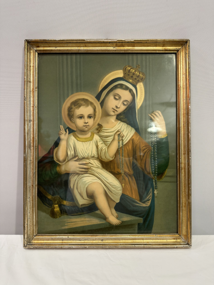 Feiner Kunstdruck, der die heilige Jungfrau Maria mit dem Jesuskind zeigt. Beide Figuren tragen Kronen und goldene Heiligenscheine. Maria hält einen Rosenkranz, während das Kind segnend die Hand erhebt, eine typische Darstellung der marianischen Frömmigkeit jener Zeit.